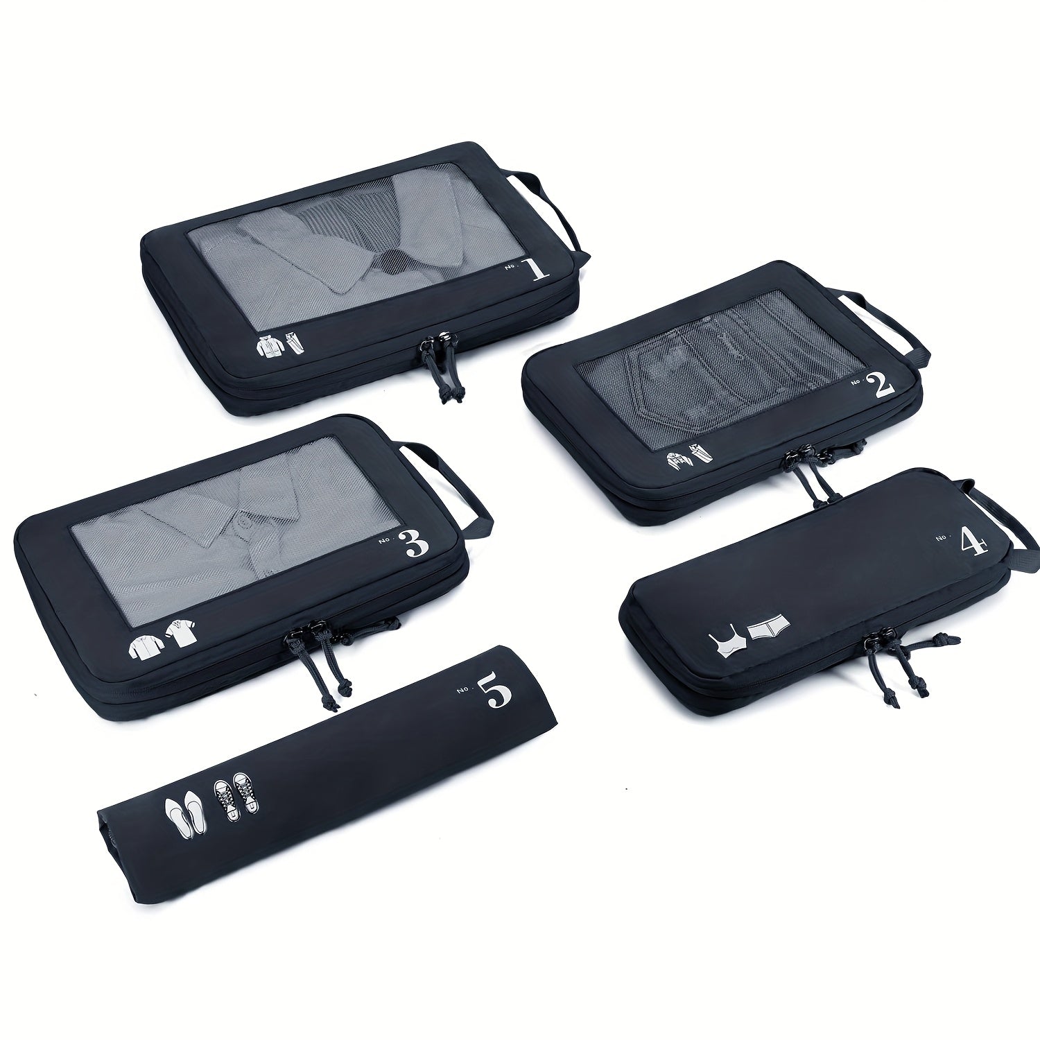 📦 5-Piece Compression System: Includes multiple bags and a shoe bag, allowing you to compress clothes and soft goods to save valuable space.